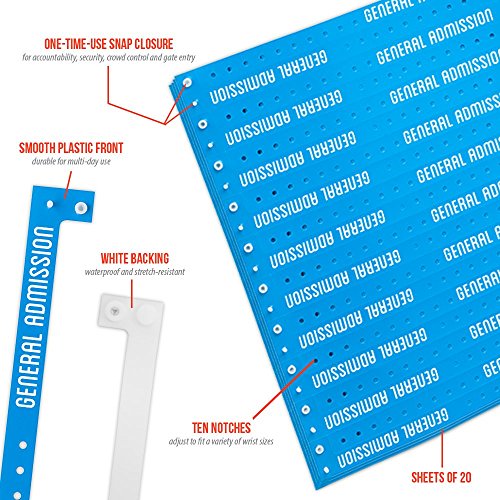 -. Feature : Comfortable & Light Weight / Secure, one time use, locking plastic snaps / Waterproof / Excellent for extended wear / 500 Wristbands in Sheets of 20.