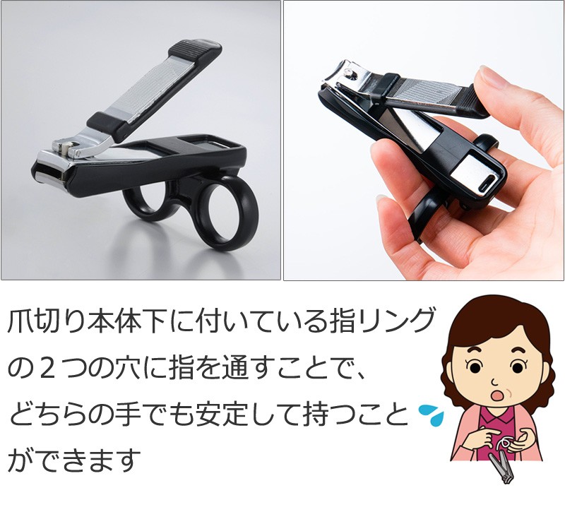 最大の特長は、爪切り本体下に付いている指リングの2つの穴に指を通すことでどちらの手でも安定して持つことが出来ます