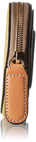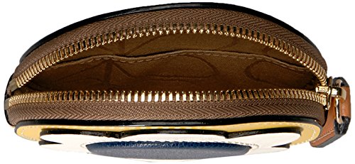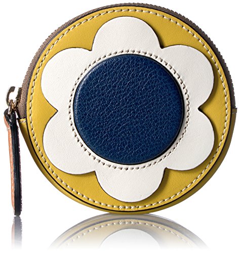 Giant flower' leather applique round purse. With back slip pocket. With zip closure. Inside details include sand linear stem jacquard lining.