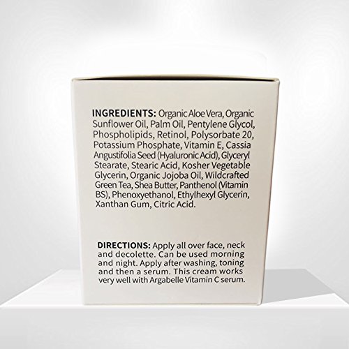 Ingredients: Organic Aloe Vera, Organic Sunflower Oil, Palm Oil, Pentlynele Glycol, Phospholipids , Retinol , Plysorbate 20 , Potassium Phosphate, Vitamin E, Cassia Angustifolia Seed , Glyceril stearate , Stearic Acid, Kosher Vegetable Glycerin, Organic Jojoba Oil , Wildcrafted Green Tea, Propolis, Shea Butter, Panthenol ,Phenoxyethanol, Ethyhexyl , Glycerin, Xanthan Gum , Citric AcidFeature