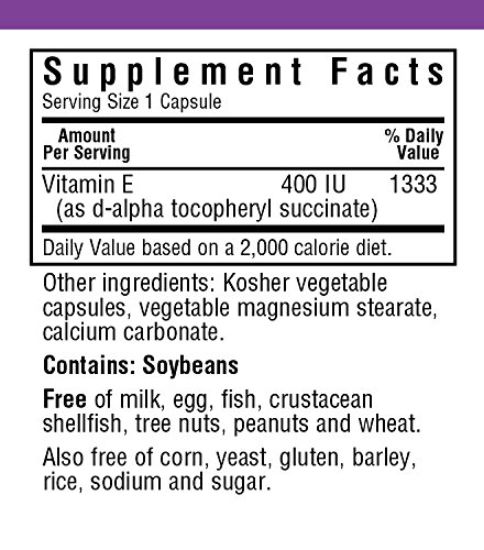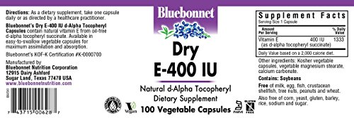 Bluebonnet's dry e-400 iu vitamin capsules provide 100% natural vitamin e from oil-free d-alpha tocopheryl succinate. Available in easy-to-swallow vegetable capsules for maximum assimilation and absorption. Vitamin e is a powerful, fat-soluble antioxidant that helps protect cell membranes against damage caused by free radicals and prevents the oxidation of ldl cholesterol. It is necessary for the structural and functional maintenance of skeletal, cardiac, and smooth muscle. It also assists in the formation of red blood cells and helps to maintain stores of vitamins a and k. Ingredients: Other Ingredients: 100% kosher vegetable capsules, vegetable magnesium stearate, calcium carbonate, Contains: soybeans. Assembled Product Dimensions (L x W x H):2.00 x 2.00 x 4.50 Inches.Feature