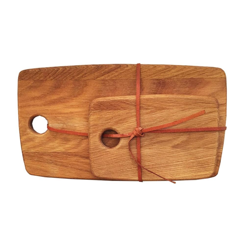 木のぬくもりが感じられる大小2枚のまな板を革ひもで結んであり、ギフトにもおススメです。