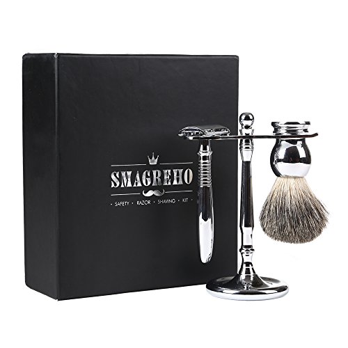 SMAGREHO Double Edge Deluxe Shaving Kit with Deluxe Stand / Pure Badger Brush / Long Handle Safety Razor Shaving and 5 Free Platinum Blades