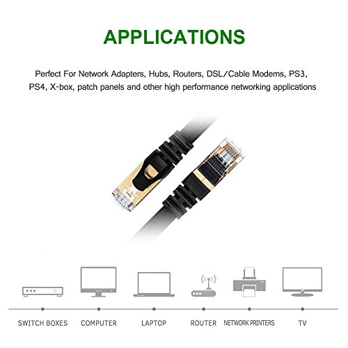 - 【High Speed】Cat7 Ethernet Cable Supports Gigabit 1000 BASE-T; 100 BASE-T; 10 BASE-T. Meets or exceeds Category 6 performance in compliance with the TIA/EIA 568-C.2 standard; High bandwidth of up to 600 MHz, guarantees high-speed data transfer for online gaming and online high definition video streaming, server applications, cloud computing, video surveillance
