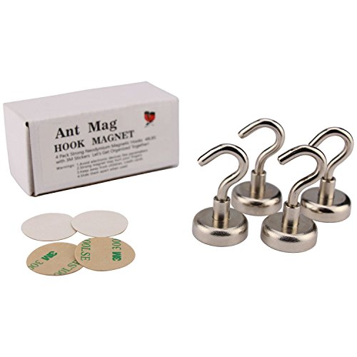 Ant Mag 4 Pack Strong Neodymium Magnetic Hooks 48LBS with 3M Stickers For Outdoor & Indoor Use! Let’s Get Organized Together! (4×48LBS)