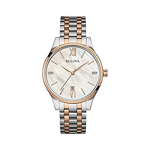 Stainless steel with silver-tone and rose-gold tone finish 4 individually hand-set diamonds White mother-of-pearl dial Flat mineral glass Three-hand calendar Double-press deployant closure