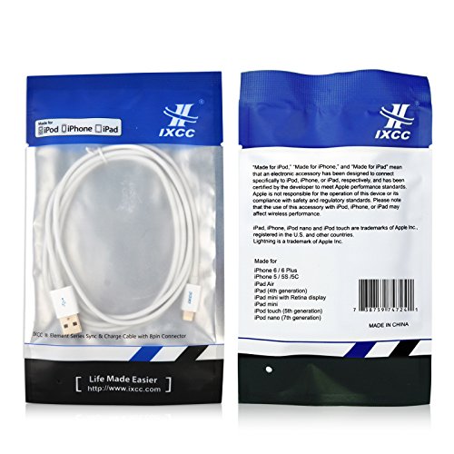 - Feature : Apple certified, MFI lightning cable. 100% Compatible with ios 8, no warning message / One convenient 3-foot iPhone/iPod/iPad cable is ideal for usage while charging in home, cars, office, and more / Compatible with iPhone 5, 5c, 5s, iPhone 6, iphone 6 Plus, iPod Nano 7, iPod Touch 5, iPad 4, iPad5, iPad Air 2, iPad Air, iPad mini 3, iPad Mini 2, iPad Mini Retina / NOT compatialbe with iPhone 4, iPad2, iPad 3, iPod Nano 6, iPod Touch 4 or earlier versions. / Please be aware of Counterfeit product from NON-iXCC sellers ! Please make sure the item Sold by iXCC to receive GENUINE Product