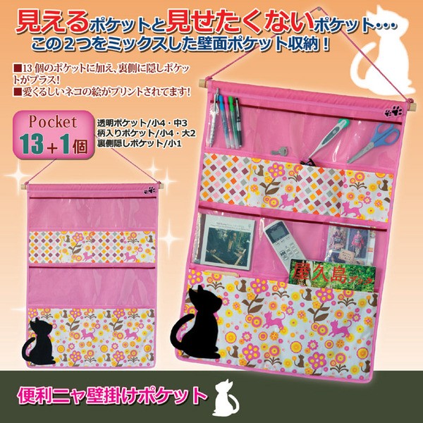 【商品名】壁面ポケット収納/便利ニャ壁掛けポケット 【猫柄】 ポケット13個/裏面隠しポケット1個付き