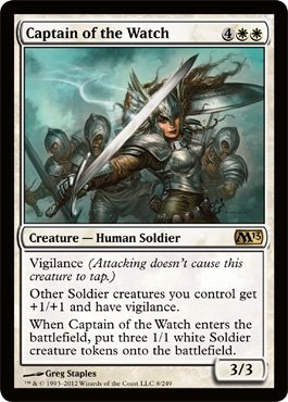 -. Binding : Toy -. Brand : Magic: the Gathering -. EAN : 0771270434740 -. Feature : Magic: the Gathering - Captain of the Watch (8) - Magic 2013 / White -. Label : Wizards of the Coast -. Manufacturer : Wizards of the Coast -. MPN : 0434740 -. PackageQuantity : 1 -. PartNumber : 0434740 -. ProductGroup : Toy -. ProductTypeName : TOYS_AND_GAMES -. Publisher : Wizards of the Coast -. Studio : Wizards of the Coast -. Title : Magic: the Gathering - Captain of the Watch (8) - Magic 2013 by Magic: the Gathering -. UPC : 771270434740