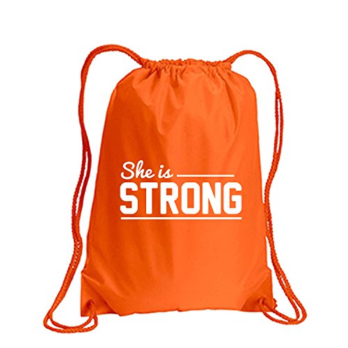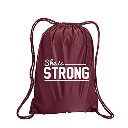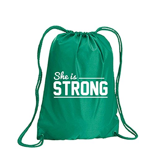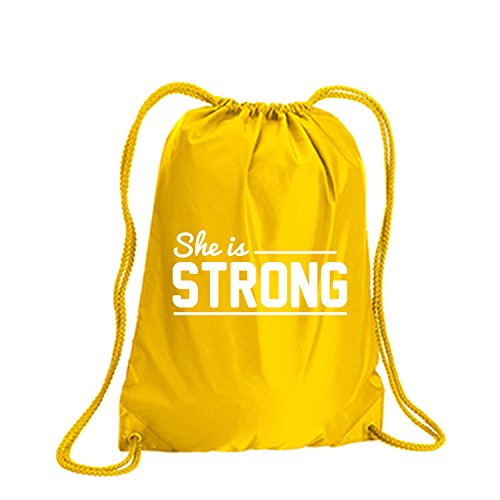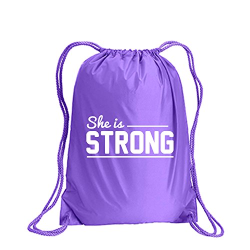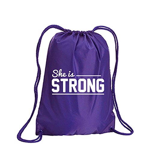 Product Description This durable and stylish nylon tote features "She is Strong" on a cinch pack tote with white ink. Bag comes in small and large sizes and is made of a durable 210 Denier nylon and has color-matched draw cords. Printed in the USA on an imported bag. 0