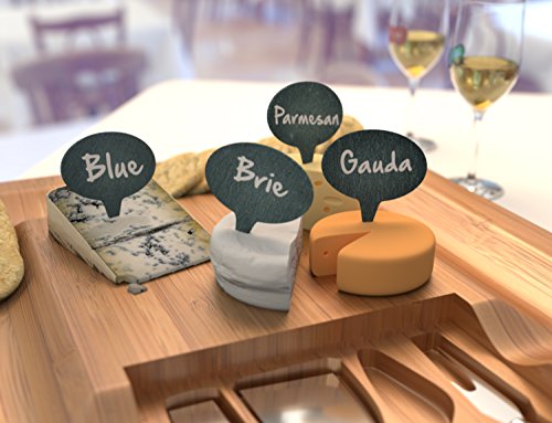 Includes 4 oval, natural slate cheese tags, and 2 pieces of soapstone chalks – Total 6 pieces in the set. Very easy to clean – Just water wash them and leave to dry.