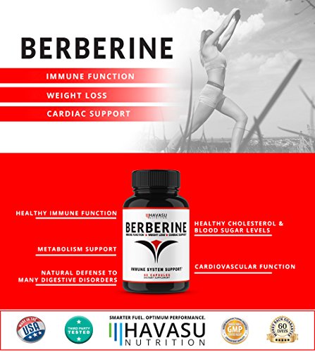Studio : Havasu Nutrition Publisher : Havasu Nutrition Binding : Health and Beauty Product Description PREMIUM BERBERINE, PROPERLY ABSORBED - THE MOST POPULAR FORMULA AVAILABLE!? Experience the Premium benefits of our potent Berberine complex that contains 500mg of pure Berberine coupled with Citrus Bioflavones, a known absorption agent, clinically proven to properly absorb Berberine. This powerful duo provides the ultimate synergistic blend to ensure maximum potency and health benefits. Our superior Berberine is formulated to support Immune Function, Cholesterol Levels, Blood Sugar Levels, Metabolism, and Cardiovascular Function. It also provides a natural defense against bacteria, fungus and other digestive disorders. You will not find any artificial ingredients or preservatives in our Berberine capsules, only the most potent all-natural ingredients available. So the next time you take out your Havasu Nutrition Berberine bottle, know that it is only the highest quality ingredients you are fueling your body with. ? Healthy Immune Function ?Healthy Cholesterol Blood Sugar Levels ? Metabolism Support ? Cardiovascular Function ? Natural Defense To Many Digestive Disorders OUR CUSTOMER COMMITMENT - Our primary goal at Havasu Nutrition is to provide the highest quality supplements using clinically proven vitamins, minerals, and herbs at a price that works for you. You don't have to compromise the quality when it comes to your health! We are here to walk with you on your health journey and are so confident that you will be satisfied with our products we offer a 100% money back guarantee, no strings attached.