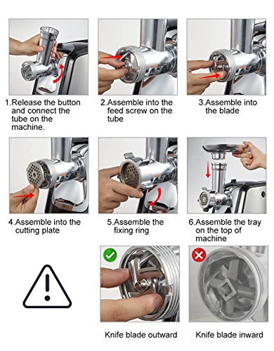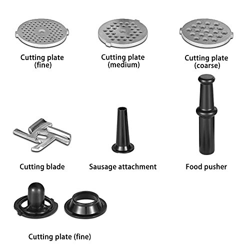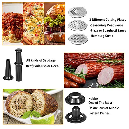 *MULTI-FUNCTION:The meat grinder includes 3 different cutting plates for coarse, medium, fine grinds of meat, fish, Wheat grass, pepper, agaric etc;It contains 1 sausage attachment,1 cutting blade,1 food pusher,1 kubbe attachment.You can choose the funtion you want.