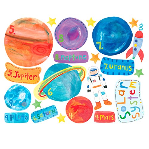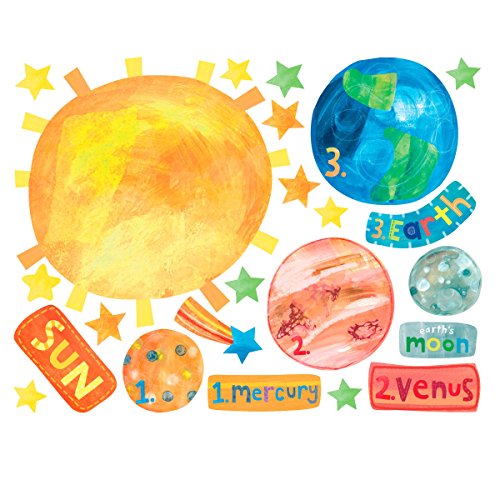 - COLORFUL SOLAR SYSTEM STICKER SET: Includes 45 individual stickers on two sheets, 1 sun wall decal, 1 moon wall sticker, 9 planet wall stickers, 12 name wall stickers, 20 star stickers, 1 astronaut wall sticker and 1 rocket wall decal