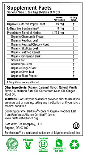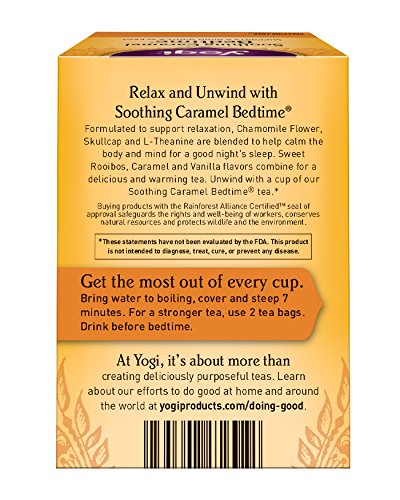 -. Feature : Relax, and breathe in the enchanting aroma of this soothing caramel bedtime tea / Chamomile, skullcap, poppy and L-Theanine support relaxation by calming the body and mind to promote sleep / Sweet, creamy rooibos, caramel and vanilla add a soothing, warming flavor / Relax and drink this soothing tea for a good night's sleep / 100% all natural herbal supplement made with non-gmo ingredients