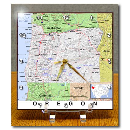 Print of Oregon Cities And State Map Desk Clock is a wonderful complement to any room in your home or office. Made of durable high grade aluminum. This frameless clock has a high gloss mirror like, UV coated, scratch resistant finish and is suitable for a moist environment. Measures 6" x 6" and requires one AA battery; not included. Battery box is not covered.Feature