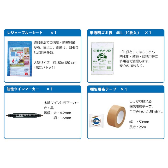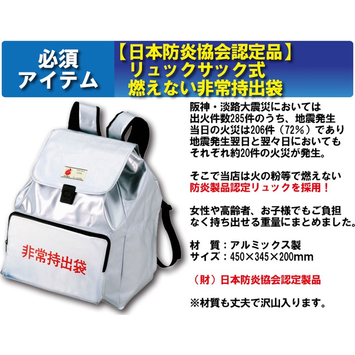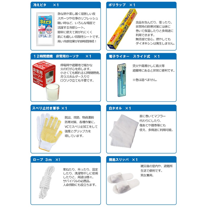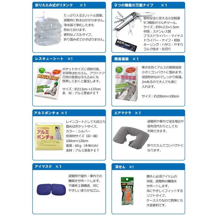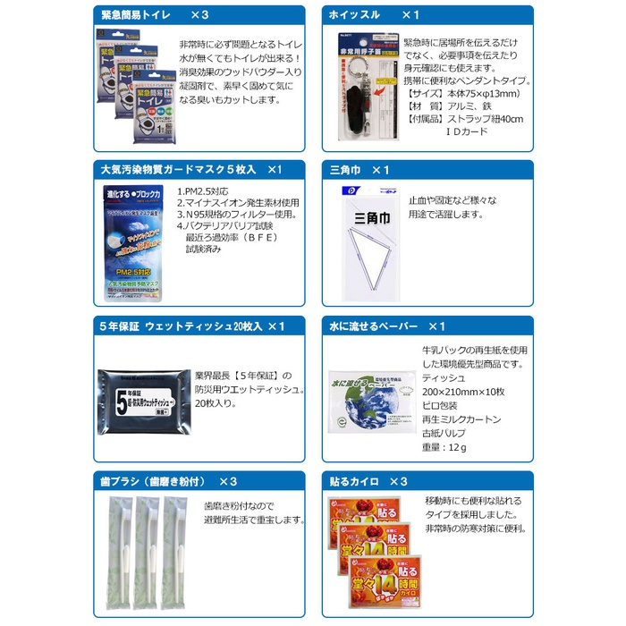 세트 내용 수량【방염협회 인정품】 비상 반출대(대) 110년 보존 카무이《왓카》려 수【500ml】 3구출 라이스(미역1카레1pilaf1) 3 프리즈드라이(freezed dry) 비스켓 2로프3m 1 난연가공 방재 쿠션 1레져 블루 씨트 1반투명 쓰레기봉지45L(10매입) 112시간 연소비상용 로우 소《구》 1《사란랏푸미니》20m 1충전식 다이나《모라지오라이토》 1재해시용 응급처치 세트 1접이식식 폴리 탱크3리터 1 한 번 쓰고 버려 슬리퍼 1LED21 등헤드라이트 1 포껌 테이프 1모리아《히토팟쿠》대 M사이즈 1모리아《히토팟쿠》가열 제 3긴급 간이 화장실1회용 남녀 겸용 3 구출 씨트 1 구출 간이 침낭 1알루미늄 판초 15년 보증 Wet 티슈 슬림제 균10매 1수에 흘려 보내는 페이퍼10W(지구무늬) 1 한 번 쓰고 버려 붙이는 카이로 3대기오염 물질 가이드 마스크(5매입) 1올라운드 멀티 툴 1트래블용 에어 베개 1 케이스 첨부이 선 1 칫솔 세트 「일본제」 3 긴급한 볼일 whistle 1 아이마스《구》 1 전자 라이터 1 삼각건 1목장갑(《스베리》지 첨부(부)) 1 단4전지4개조 1 백타올 1유성 마커 굵다/세트윈 검정 1라이온◇차가와져《피타》어른용2매입 1