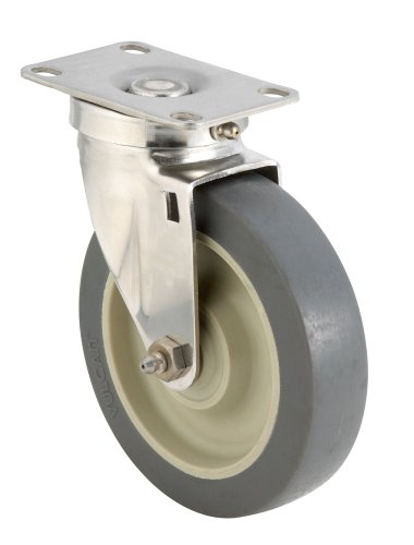 E.R. Wagner Plate Caster, Swivel, Thread Guard, Polyolefin Wheel, Roller Bearing, 300 lbs Capacity, 5" Wheel Dia, 1-1/4" Wheel Width, 6-3/16" Mount Height, 3-3/4" Plate Length, 2-3/4" Plate Width