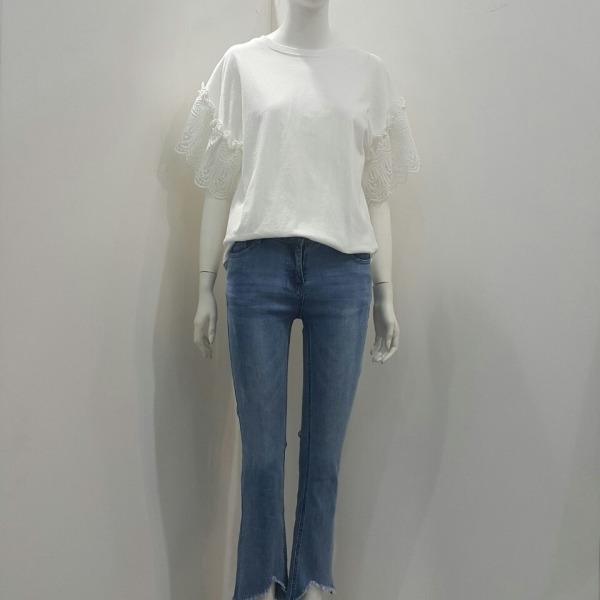 라운드티셔츠에 소매레이스진주가 포인트되는 티셔츠입니다여성스러운 느낌에 티셔츠형 블라우스입니다