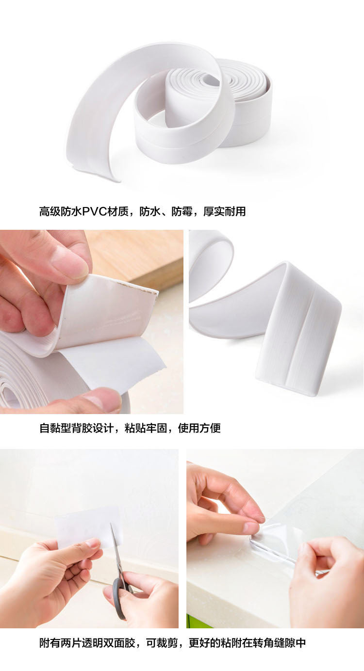 贴在水槽和台面的接缝处,防潮防霉,且容易擦洗,还能用在煤气灶和台面的接缝处等。贴合处及四周位置需先清洁干净干燥,保持干净无污后再贴,否则会影响粘胶效果。