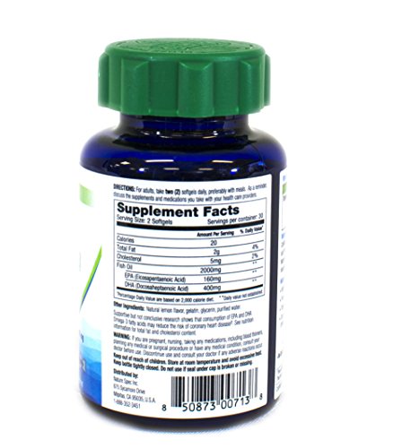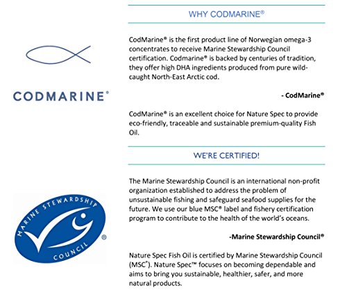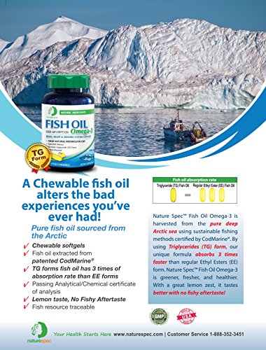 Nature Spec Fish Oil Omega-3 is harvested from the pure, deep Arctic sea using sustainable fishing methods certified by CodMarine®. By using Triglycerides (TG) form, our unique formula absorbs three times faster than regular Ethyl Esters (EE) form. Nature Spec Fish Oil Omega-3 is greener, fresher, and healthier. With a great lemon zest, it tastes better with no fishy aftertaste! Nature SpecTM Fish Oil is sourced fresh and direct from MSC - certified fisheries in the Artic Sea. Every bottle is produced in our GMP - certified facility. Pure, Natural, and Traceable Fish Oil that you can trust! Nature Spec Fish Oil Advantages: . Fish sourced from pure deep arctic . Traceable fish resource . Fish oil extract from patented CodMarine® . TG form fish oil has three times the absorption rate of EE form . High content of DHA . Lemon flavor, no Fishy Aftertaste . Variety of eating methods . Brain, Heart & Immune System Support . Pure CodMarine® Omega-3. Non-GMOFeature