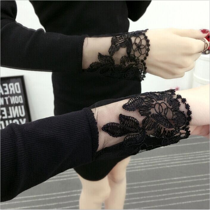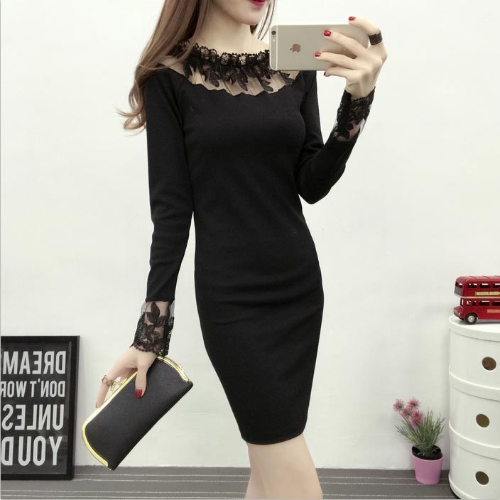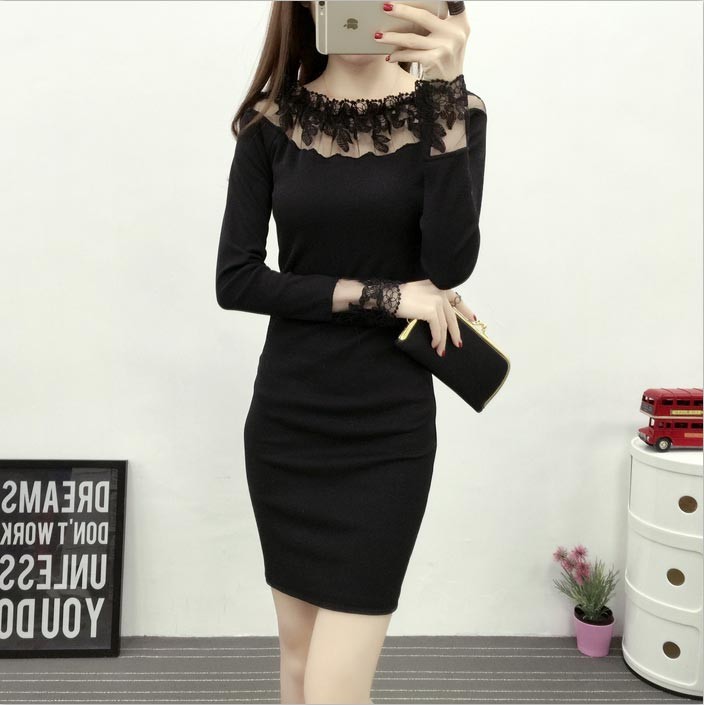ショルダー&袖口にブラックレース・ロングスリーブ・ミニ丈のワンピース♪