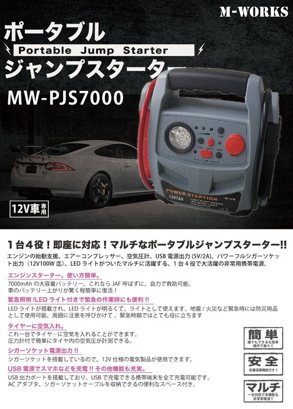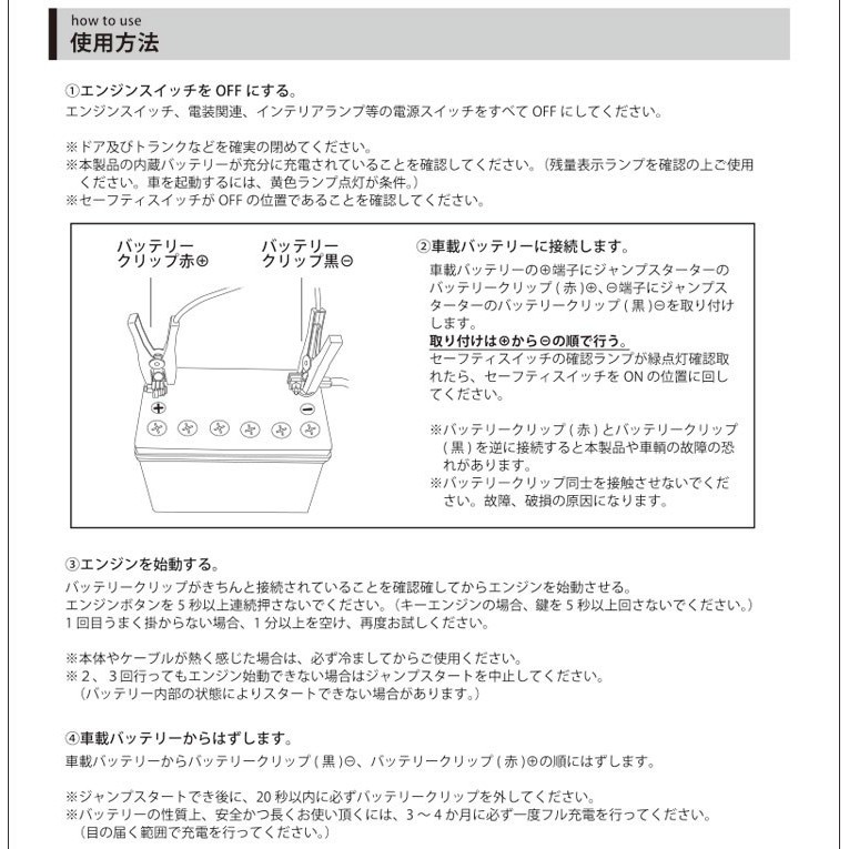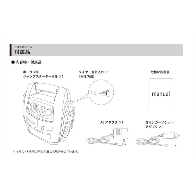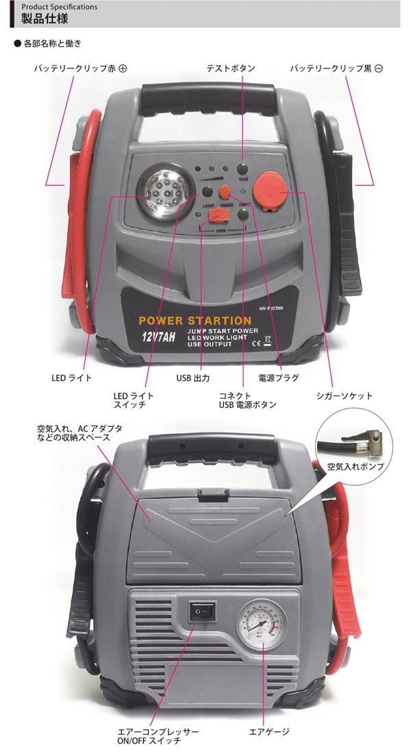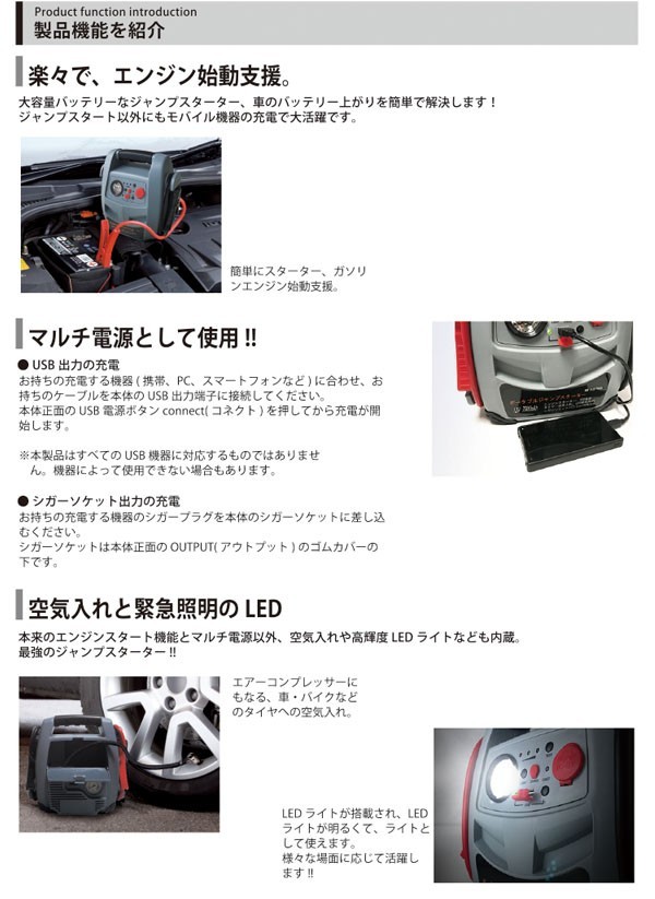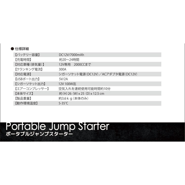 | 商品説明 | ●いざに備え、あらゆるシチュエーションに対処できます。 ●エンジンスターター ●タイヤ―空気入れ ●緊急照明LED ●シガー電源出力 ●USB電源でスマホなどを充電 ●対応車種:12V専用 2000CC迄 ●電池容量:12V 7AH 約84W ●クランキング電圧:300A ●USBポート:5V/2A ●シガー出力:12V 100W ●動作環境温度:5~35℃ ●本体サイズ:約26×25×12.5cm ●本体重量:約3.6kg ●JANコード:4589657991009 【セット内容】・取扱い説明書 ・ポータブルジャンプスターター・取扱い説明書 ・タイヤ空気入れ(本体内蔵)・取扱い説明書 ・ACアダプタ・取扱い説明書 ・専用シガーソケットアダプタ・取扱い説明書 ・取扱い説明書 |