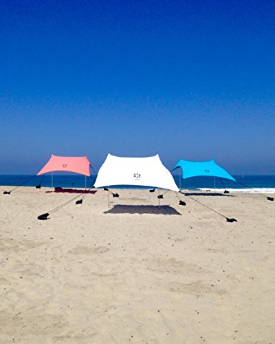 -. Feature : Made of high quality Nylon/Lycra blend; 82 inches x 78 inches (6.5' x 6.8') / Comes with 19.5 inch shoulder carrying bag and 2 poles / Corner sand anchors can be weighed down with sand, rocks, or other resources / Lightweight 3.9 pounds!!! Easy to carry, Portable to Fit in carry-on suitcase / 50+ UPF rating for sun protection; Water Repellent for rain; Reinforced Corners for longer lasting. FAQs on website for set-up tips.