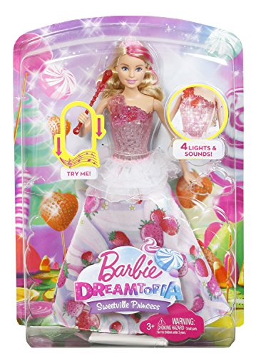 Bring the magic of Barbie Dreamtopia's Sweetville Kingdom to life with Barbie Sweetville Dreamtopia princess dolls that have child-activated lights and sounds!