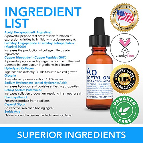 NEW IMPROVED INGREDIENTS :: NEW PACKAGING :: MADE IN USA A Potent Combination Of Ingredients Resulting In Amazon's Most Powerful Anti-Aging Serum 30% Reduction In Wrinkles In 21 Days Or Your Money Back Our serum has a strong reputation of containing the 3 most powerful anti-aging ingredients. Our main ingredient, Argireline, is the same protein found in botulinum toxin (Botox) for smoother, younger looking skin.
