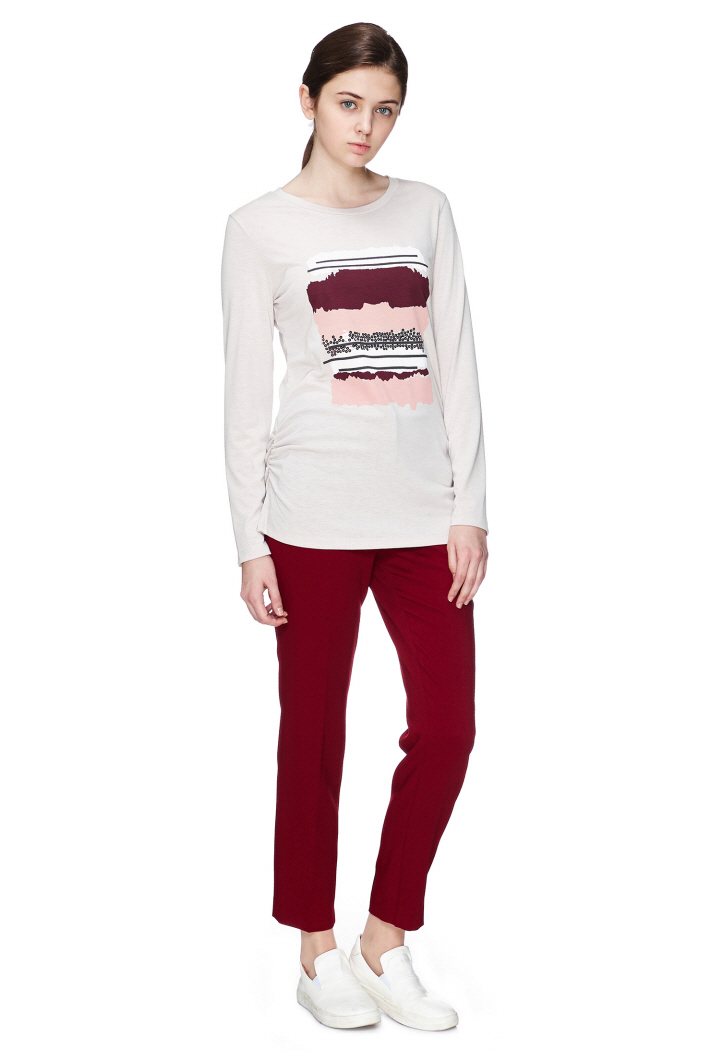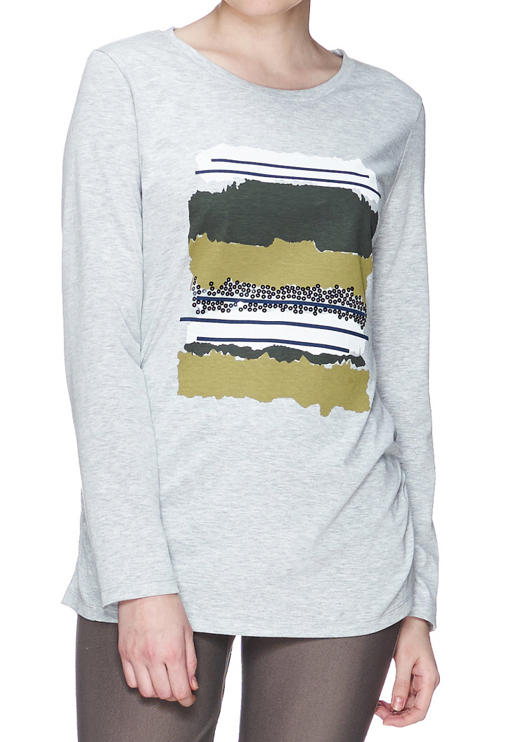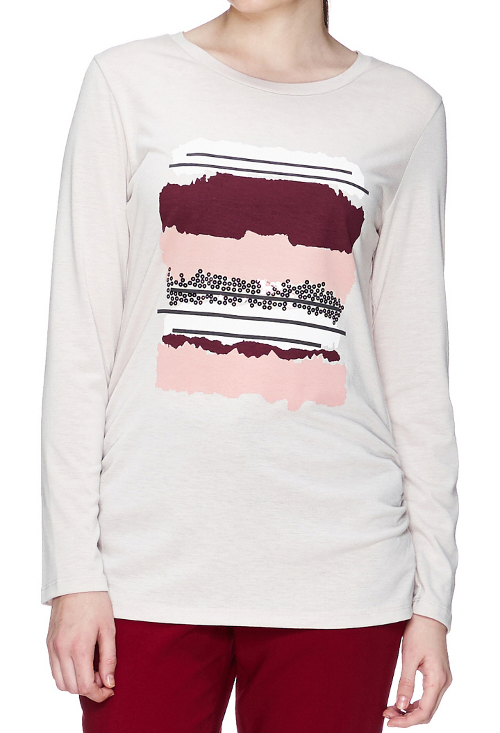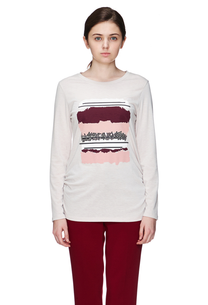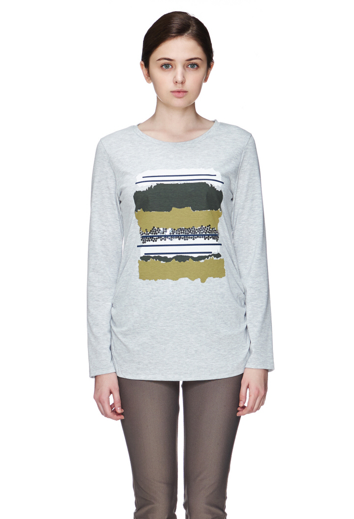 기본 디자인에 프린트와 스팽글 장식으로 포인트를 주었고 허리라인 셔링을 잡아주어 여성미도 더했습니다