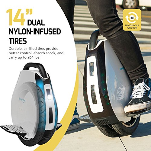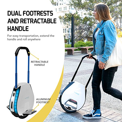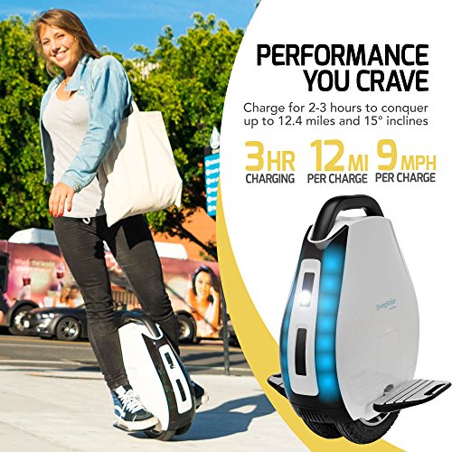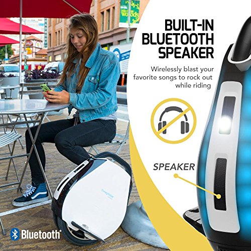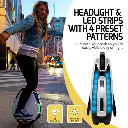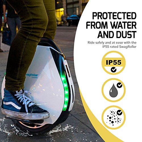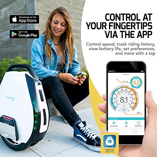 Show off your swag with SWAGTRON's newly crafted, motorized unicycle: the Swag Roller. Whether you're an explorer venturing down dirt roads, a country dweller racing through grass, or an urban go-getter zigzagging down the street, the Swag Roller will be the perfect multi-terrain companion. In a single charge, the 450 W motor travels up to 12.4 miles, tackles inclines up to 15 Degree, and carries up to 264 lbs effortlessly. The unicycle scooter features 14" dual air-filled tires on a single aluminum rim for unbeatable traction and shock absorption not seen anywhere else, so you can ride comfortably through any terrain. With the gyroscopic technology, speed up, slow down, and make turns-all with just a shift of your weight. You'll be able to adventure anywhere! Cruise down high-traffic boulevards while exploring day or night using the bright headlight and LEDs for continuous visibility. Even beginners will have no fear with the included training wheel accessories. When you're done riding, simply fold the metal footrests and use the retractable handle to roll the Swag Roller to class or work. Its compact 16.5x20.5x5 inch size allows for storage beneath desks and inside car trunks, making it perfect for commuting students. You can even rock out all the way to class using the Bluetooth speakers! Customize your one wheel scooter and show off your personality by choosing one of four preset LED patterns via the Android/iOS app.Feature
