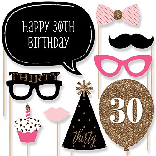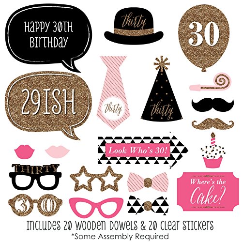 20-Piece Pink, Black and Gold Photo Booth Props Kit INCLUDES 20 Chic 30th Birthday photo booth props, 20 wooden dowel sticks and adhesives for assembly. EASY ASSEMBLY: Simply attach the printed DIY photo booth props to the wooden dowels with included adhesive and reinforcing stickers.