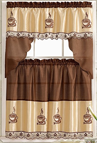 Coffee Embroidered Kitchen Curtain Tiers & Swag Set Brown-beige - 60x36 & 30x36 by LiveDeco
