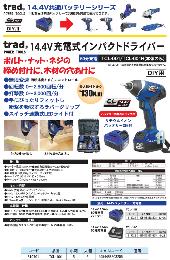 ●セット内容:14.4V充電式インパクトドライううバー/14.4V1.5Ah共通リチウムイオンバッテリーパック 2個/14.4V 1.5Ah60分充電器・・コード長 約1.8m/6.35mm差込角ドライバー両頭ビット(+No.2x65mm)1本
