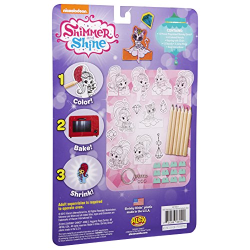 Shimmer and Shine Shrinky Dinks Activity Set gives you characters from the animated series that you can color, bake and shrink, turning them into stand up figurines! Make Shimmer, Shine, Nahal, Tala and more! Stand them up and have them play with each other. There's materials to make a keychain! Includes 12 Shrinky Dinks, 6 colored pencils, key ring, chain, 12 stands, 3 jump rings and instructions. Recommended for children 5 years of age and older.Feature