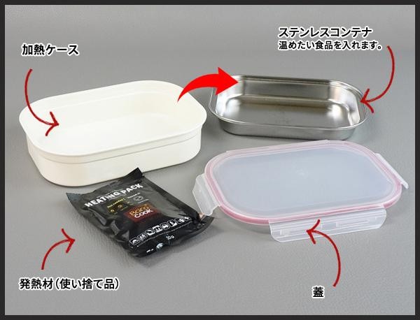 ステンレスコンテナと加熱ケースとの2重底構造になっており、加熱ケースに発熱材と少量の水を入れる事で反応して蒸気を発生させ、いつでもどこでも温かい食べ物が楽しめます。電気が使用できない場合でも使用可能なので、防災・緊急時・アウトドアなどにおすすめです。 |