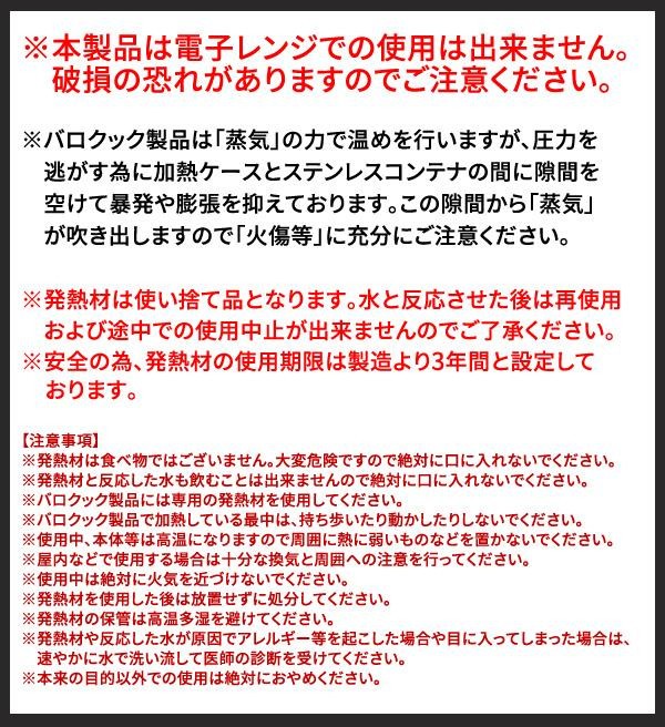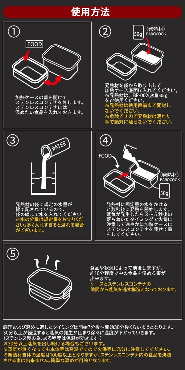 | 素材・材質 | 加熱ケース・蓋:樹脂(PP)、コンテナ:ステンレス、パッキン:シリコンゴム、発熱材:生石灰 |