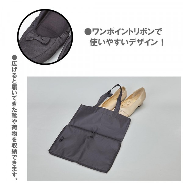 収納袋付きで持ち運びラクラク♪旅行先や卒入学式にピッタリです。履き口はゴム入りなので、脱げにくく、足にしっかりフィットします。上品なサテン生地にワンポイントリボンで使いやすいデザインです。 |