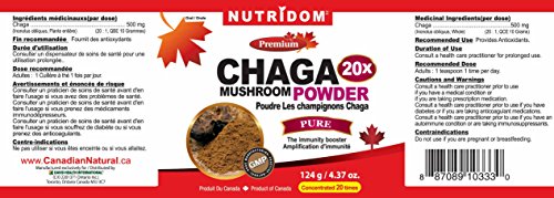 -. Binding : Health and Beauty -. Brand : Nutridom -. EAN : 0887089103330 -. Feature : Contains Canadian Chaga mushroom / Wild harvested by hand in Canada / Natural Immune-booster with B-glucan & Betulinic acid / Provides 20 times more effect than other Chaga products -. IsAdultProduct : 0 -. Label : David Health -. Manufacturer : David Health -. MPN : N114 -. PackageQuantity : 1 -. PartNumber : N114 -. ProductGroup : Health and Beauty -. ProductTypeName : HEALTH_PERSONAL_CARE -. Publisher : David Health -. Studio : David Health -. Title : NUTRIDOM Chaga 20X Powder 124g / 4.37 oz -. UPC : 887089103330