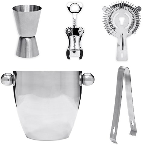-. Feature : 16-piece bartending set is perfect for beginners to practice the fundamentals and mix like a pro / Mix enough for up to 3 drinks at once with the included one-handed cobbler shaker / From pourer to stopper, and strainer to muddler, this set has everything you need to get started / Included ice bucket and tongs are perfect for chilling bottles or to use when mixing on the rocks / Bucket Dimensions: 5.75"(Dia) x 5.5"(H)