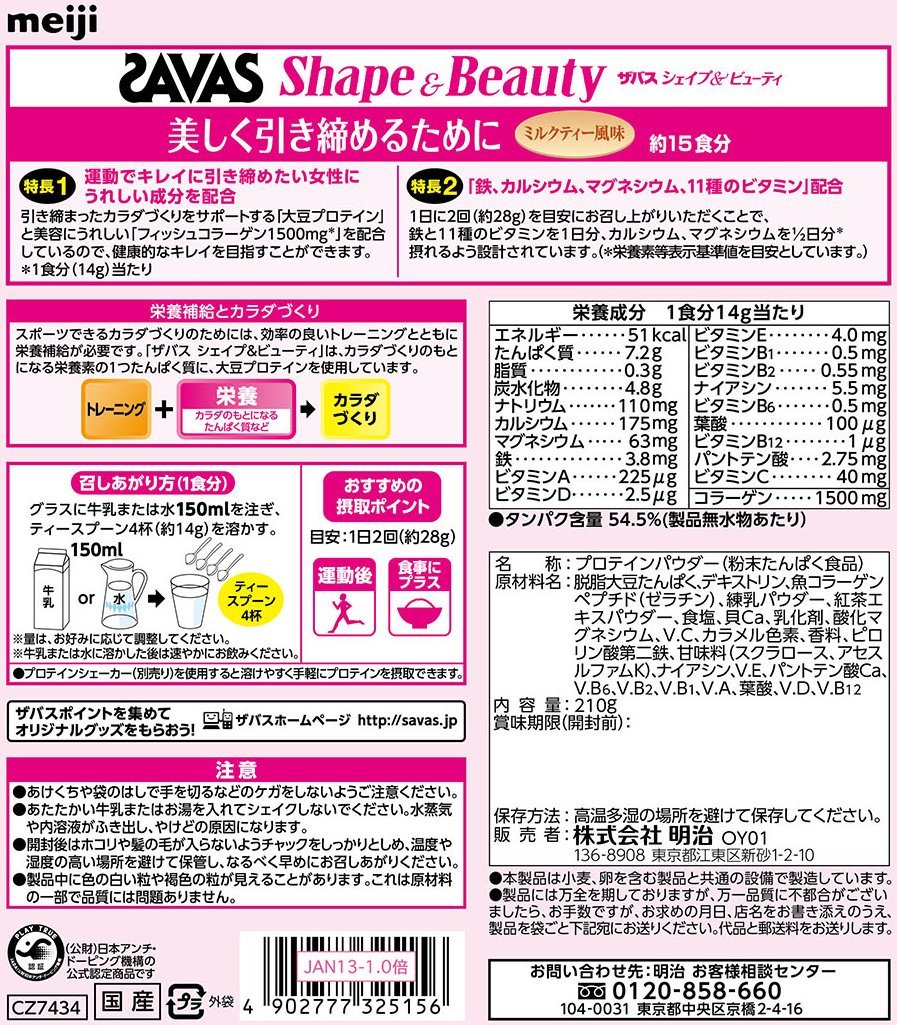 原材料:脱脂大豆たんぱく、デキストリン、魚コラーゲンペプチド、練乳パウダー、紅茶エキスパウダー、食塩/貝Ca、乳化剤、酸化マグネシウム、V.C、カラメル色素、香料、ピロリン酸第二鉄、甘味料(スクラロース、アセスルファムK)、ナイアシン、V.E、パントテン酸Ca、V.B6、V.B2、V.B1、V.A、葉酸、V.D、V.B12、(一部に乳成分・大豆・ゼラチンを含む)