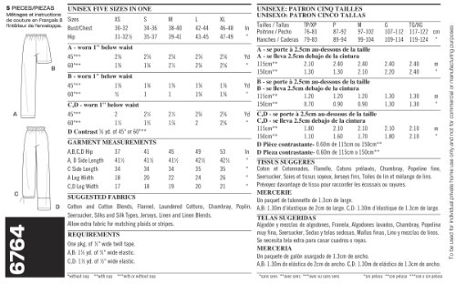 -. Feature : Miss/Men Separates in size A (XS-S-M-L-XL), New Look Pattern #6764 / Number of looks included: 4 / Designed in UK, Manufactured in USA / Instructions are written in English, Spanish, and French / Sested fabrics: Cotton and Cotton Blends, Flannel, Laundered Cottons, Chambray, Poplin, Seersucker, Silks and Silk Types, Jerseys, Linen and Linen Blends; allow extra fabric for matching plaids or stripes