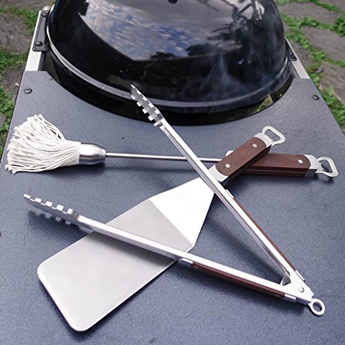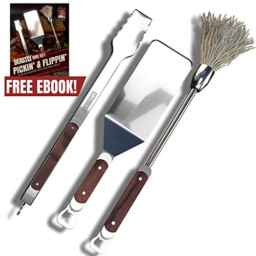 THESE BAR B QUE TOOLS ARE A MUST FOR ALL GRILL MASTERS! Beastly 3 Piece Professional Grade BBQ Set includes Beast Shovel: Grill flipper large-blade spatula, with a bottle opener at the base of the handle. Beast Tongs: Long Reach Precision Grip Heavy Duty Tongs. The Beast Mop: BBQ Basting Mop also doubles as a bottle opener