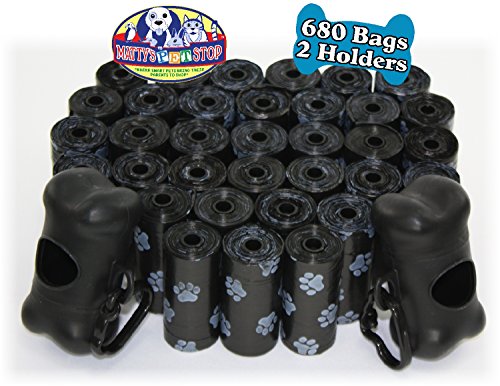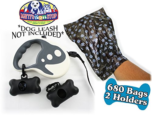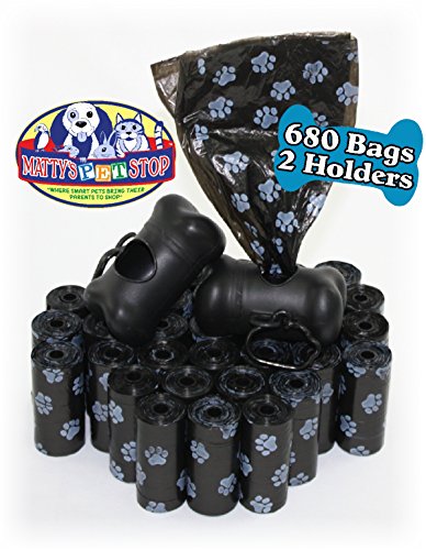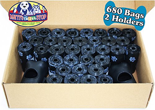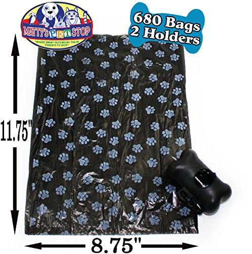 Product Description Matty's Pet Stop 680 Count (34 Rolls) Unscented Dog Waste/Poop Bags with 2 Dispensers - Black Paw Print Design! Strong quality pet waste bags - leak-proof! Each bag is marked at perforation for easy separation. Rolls fit into standard leash dispensers. Bag Size: 11.75" x 8.75" 0