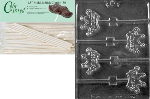 Cybrtrayd 45St50-K139 Princess Crown Pops Kids Chocolate Candy Mold with 50 Cybrtrayd 4.5-Inch Lollipop Sticks