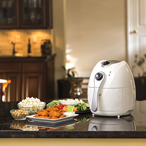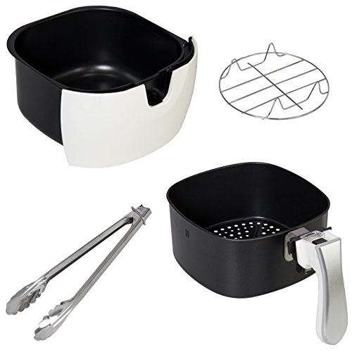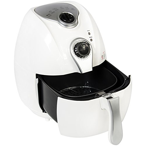 Tired of fatty, unhealthy food but love that deep-fried taste? This air fryer has got your next party covered, with rapid air fry technology that cooks your food the healthy way! Say goodbye to fatty oils and hello to delicious home-cooked fried food. Featuring many different cook settings for all types of tasty treats, this air fryer will have you asking for seconds! SPECIFICATIONS: Includes stainless steel grates and frying tongs; Overall Dimensions: 13"(L) x 10"(W) x 13"(H); Weight: 11.05 lbs.; Basket Capacity: 2.7L; Pan Capacity: 4.4qt; Material: Plastic; Volts:110-120V, 60Hz; Temp Range: 176F -392F; Color: White; No assembly required