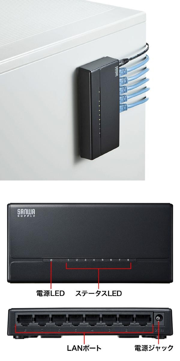 マグネット付きでスチールデスクなどに固定できる10/100BASE-T対応の8ポートスイッチングハブです。