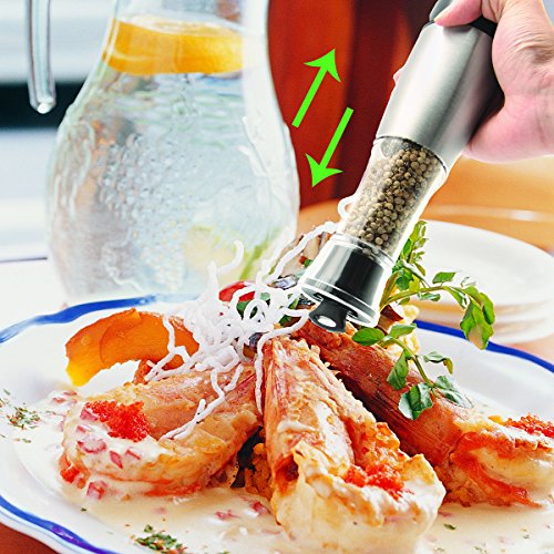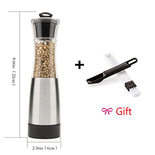 Product Description Features: Stainless steel material, high quality and durable for use Electronic motor, powered by 6 * AAA batteries (Not included) Innovative pepper mill dispenses spices with speed and ease Suitable for milling peppercorn, salt, mustard and other small-sized spices Effortless and convenient, perfect for both home and restaurants use Wonderful gadget to make freshly pepper or salt for enjoying a tasty salad or steak Specifications: Material: Stainless Steel Scrylic Product Weight: Approx. 10 Ounces Product Size: Approx. 2.4" x 8.7" Using Instructions: 1. Remove top of the mill, fill in spice. 2. Install 6 AAA batteries (Not included). 3. Assemble the top cover back. 4. Adjust the grinding coarseness you like. 5. Turn upside down, grinding automatically. Package include: 1 x Electric mill 1 x Gift brush Note: 1. Please use brand new batteries and don't leave the batteries inside during extended periods of non-use. The batteries may leak and damage the mill. 2. Before filling and reassembling, make sure the grinder is dry enough and store your mill in a dry place after use. 3. Shake or brush the mill if the seasoning is clogged. If the seasoning becomes damp or the mill becomes clogged, clean with wet towel. Recommend to purchase 2 units, in order to match set for both salt and pepper! 0