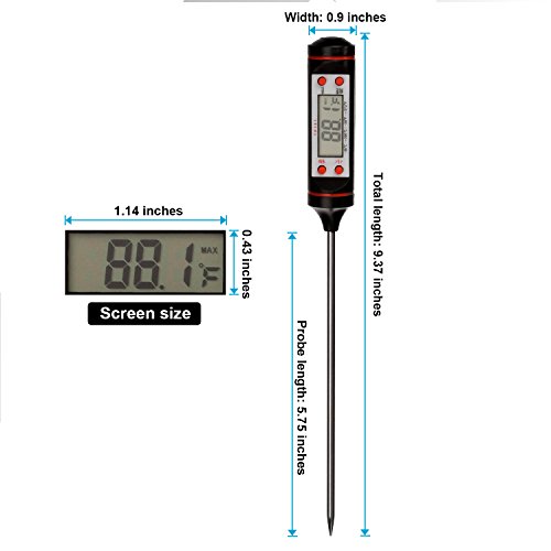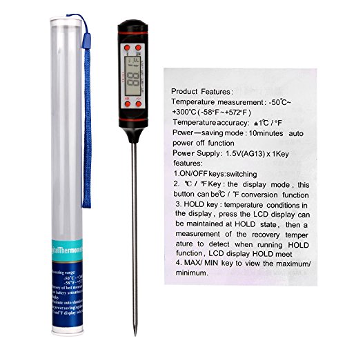 Studio : HEYFIT Publisher : HEYFIT Product Description Fetures: Mini Digital Cooking Thermometer Sensor Prober Working Voltage: 1.5V(included). Low battery sensation and display. Lightweight and portable Memory of last measure . 10 minutes auto shutdown for power saving . Great tools for kitchen food ,restaurant . Specification: Color: Black / White Total length: 23.8cm/9.37" Probe length: 14.6cm/5.75" Width:2.3cm/0.9" LCD screen size:2.9cm*1.1cm / 1.14" * 0.43" Product net weight: 23g , with packing total weight :43g Package included: 1 x Digital thermometer 1 x Battery 1 x English Manual 1 x Plastic cylinder packaging